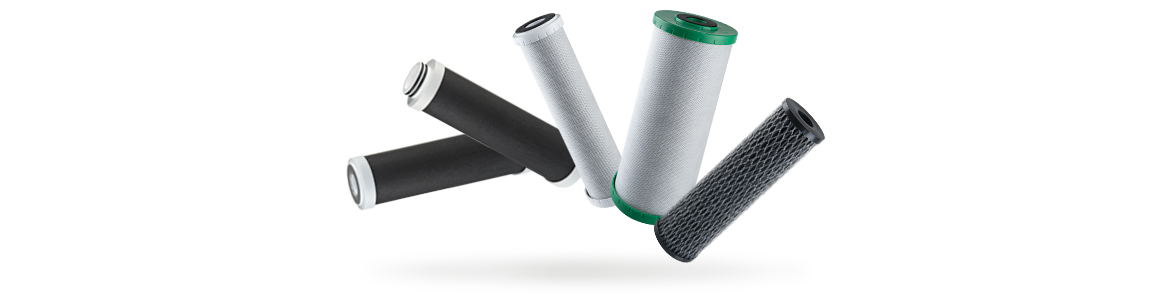 Water treatment filter cartridges with coconut shells activated carbon block for removing volatile organic substances, chlorine, flavours and bad odours from water.