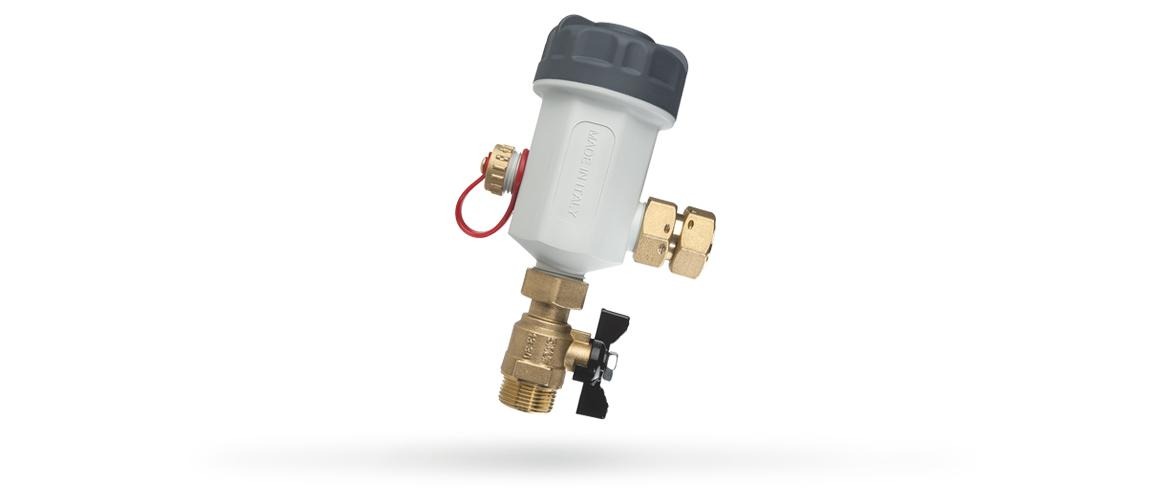 FDM-1P peut être installé avec différentes orientations : en cas d’espaces limités sous la chaudière (par ex. chaudière installée dans des meubles suspendus de cuisines) FDM-1P doit être installé avec le corps principal horizontal et le bouchon tourné de face. S’il y a une plus grande disponibilité d'espace pour l’installation, il est possible de positionner FDM-1P avec le corps vertical et le bouche tourné vers le bas. Afin de permettre ces configurations d'installation, il suffit d’inverser la position du raccord tournant de connexion de la chaudière et celle du clapet à bille, et de tourner le filtre de 90°. Les raccords présents sur le corps principal ont été réalisés avec filetage G 3/4”, le vidange avec filetage G 1/2”. FDM-1P est fourni avec le clapet à bille et le raccord tournant en laiton.